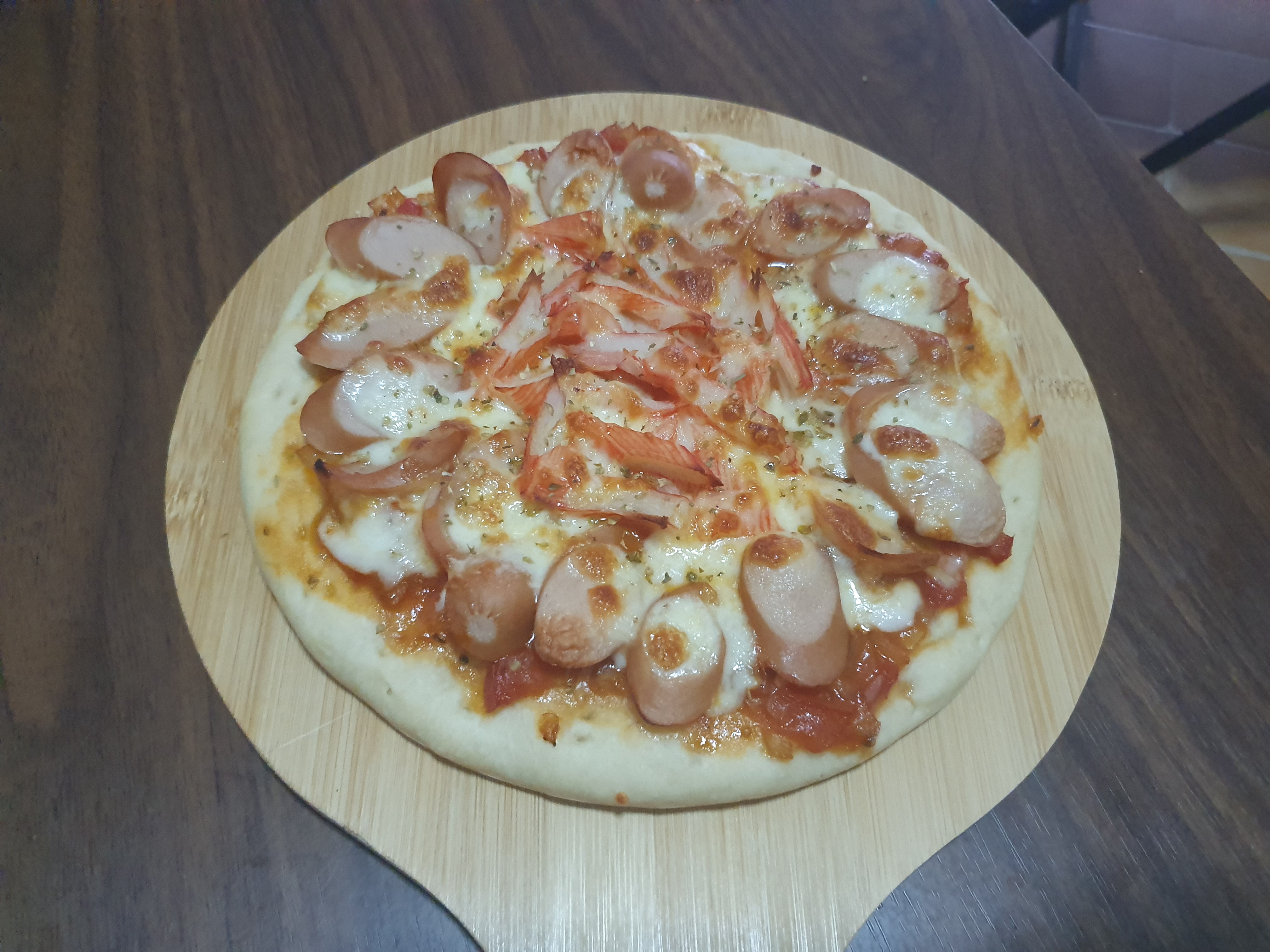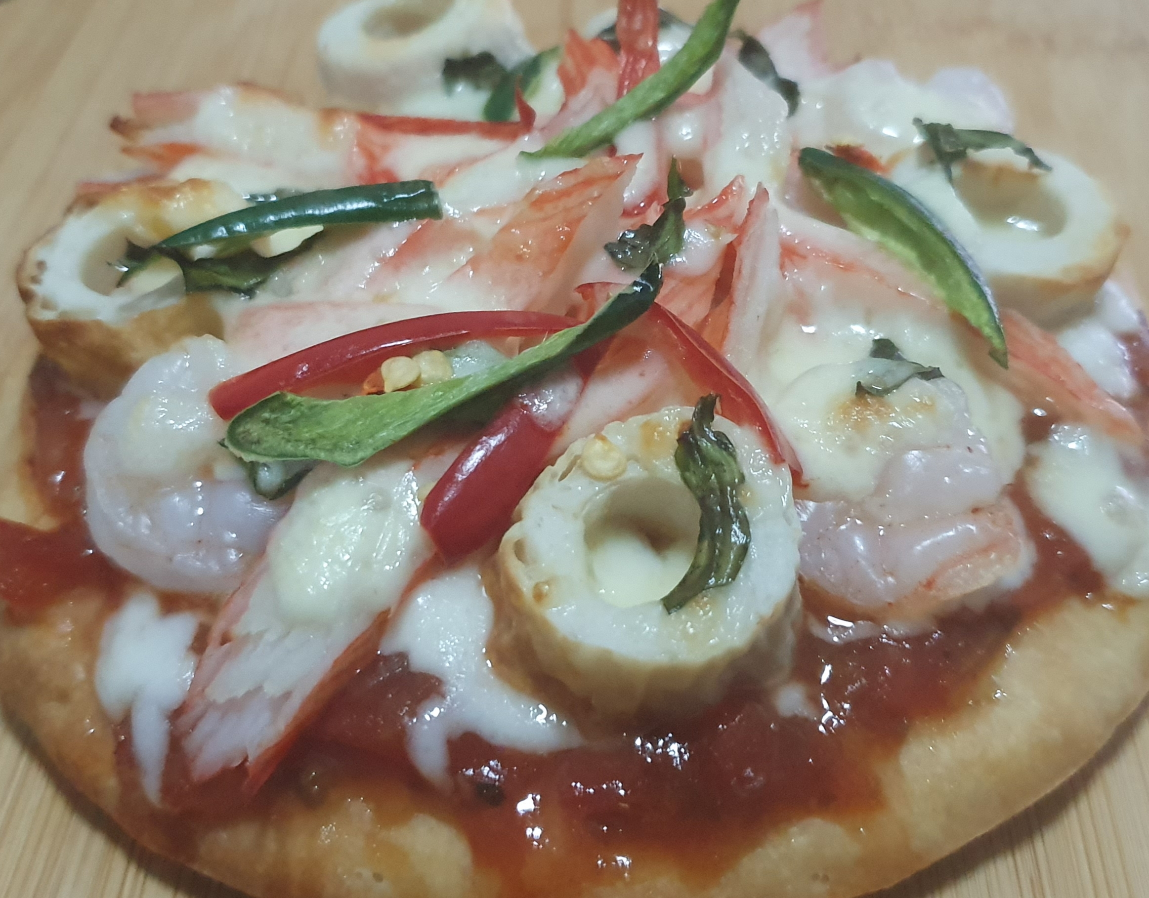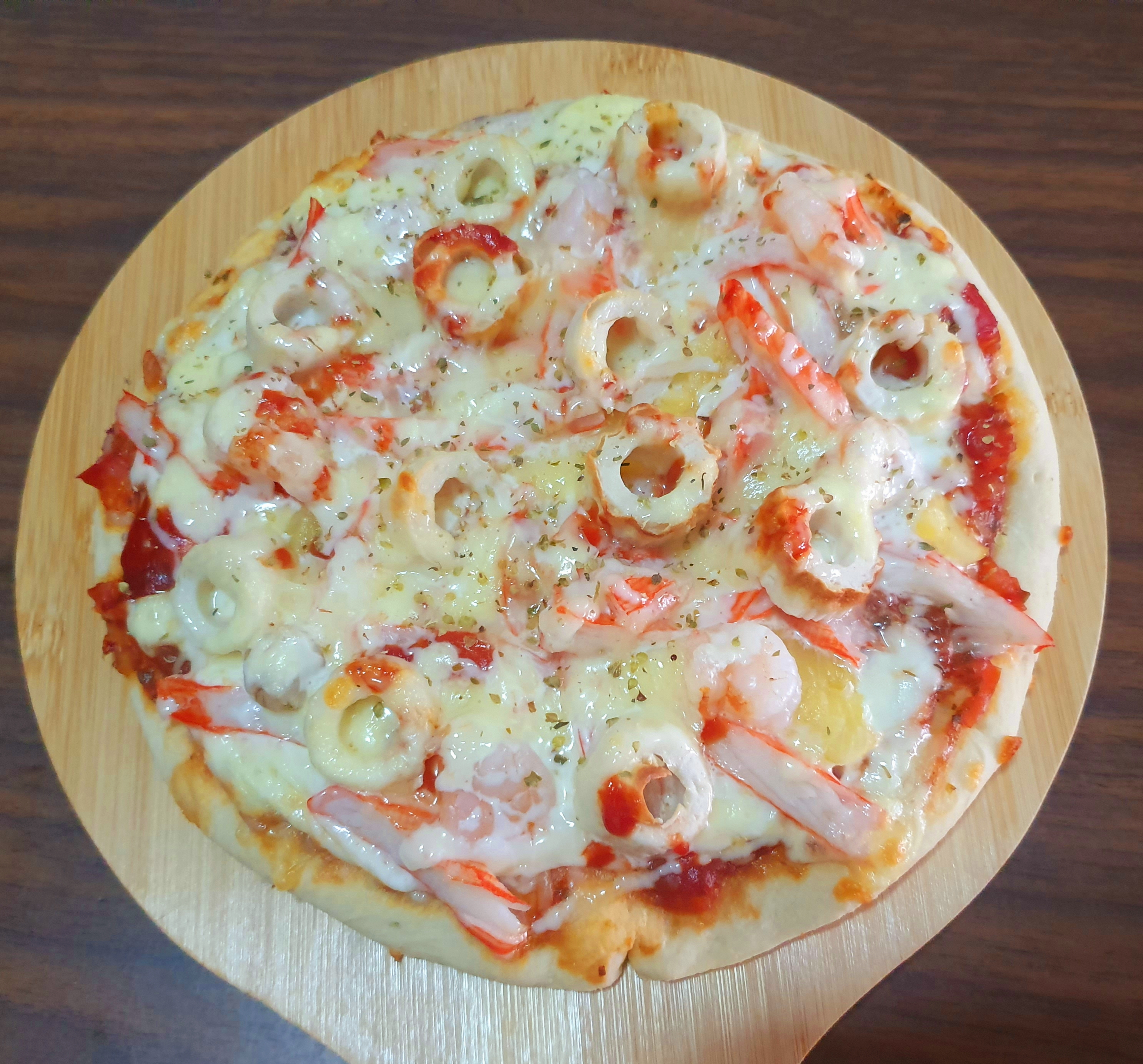 ทำจากแป้งพิซซ่า และซอสพิซซ่าสูตรพิเศษ โรยหน้าด้วยมอสซาเรลล่าชีส ใส่ท็อปปิ้งเป็น กุ้ง ปูอัด หมึกหลอด และสับปะรด โรยหน้าด้วยมอสซาเรลล่าชีสอีก 1 ชั้น
