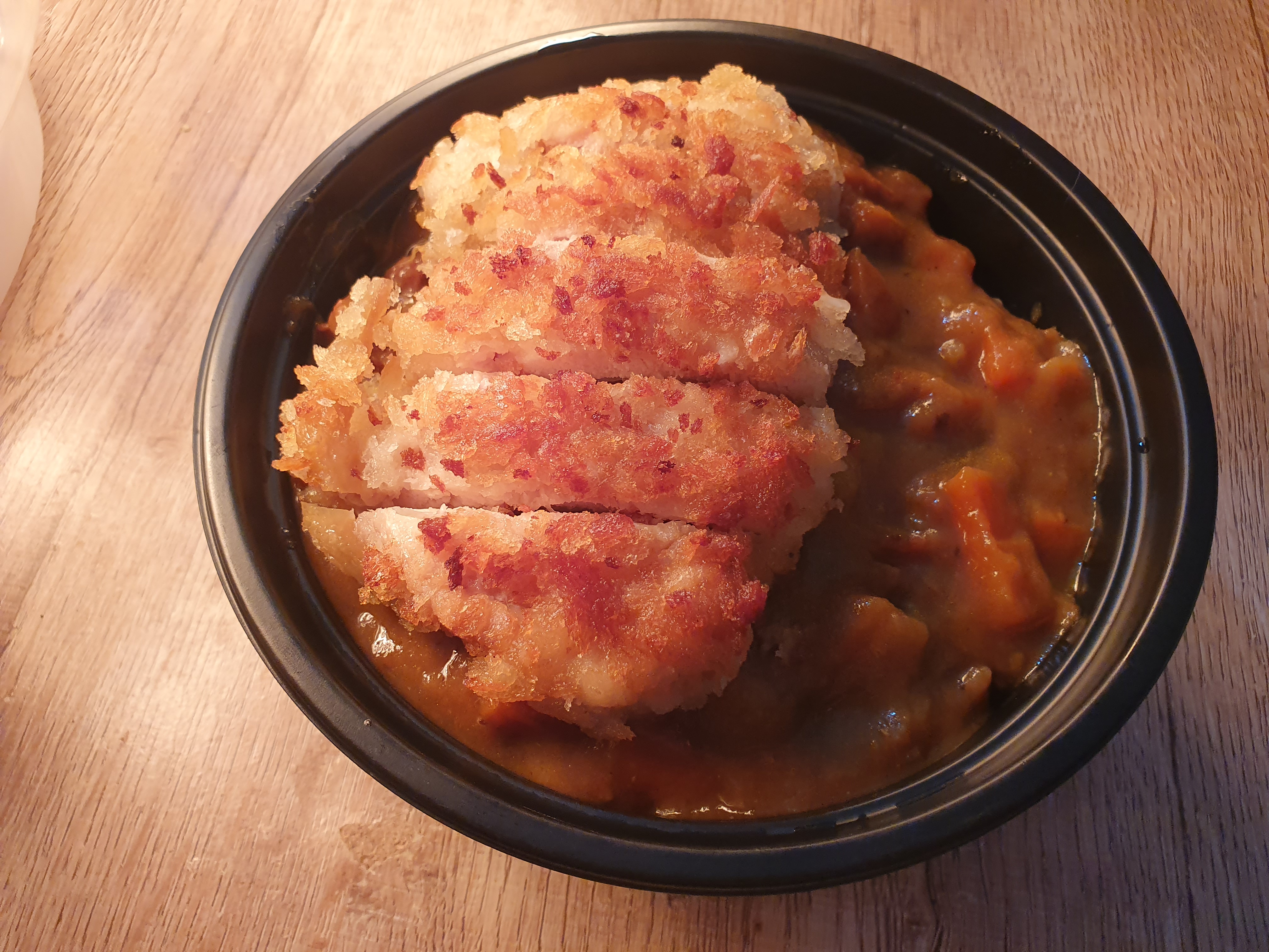 ข้าวสวยร้อน ราดด้วย แกงกะหรี่สูตรญี่ปุ่น ท็อปปิ้งเป็นไก่ทอด