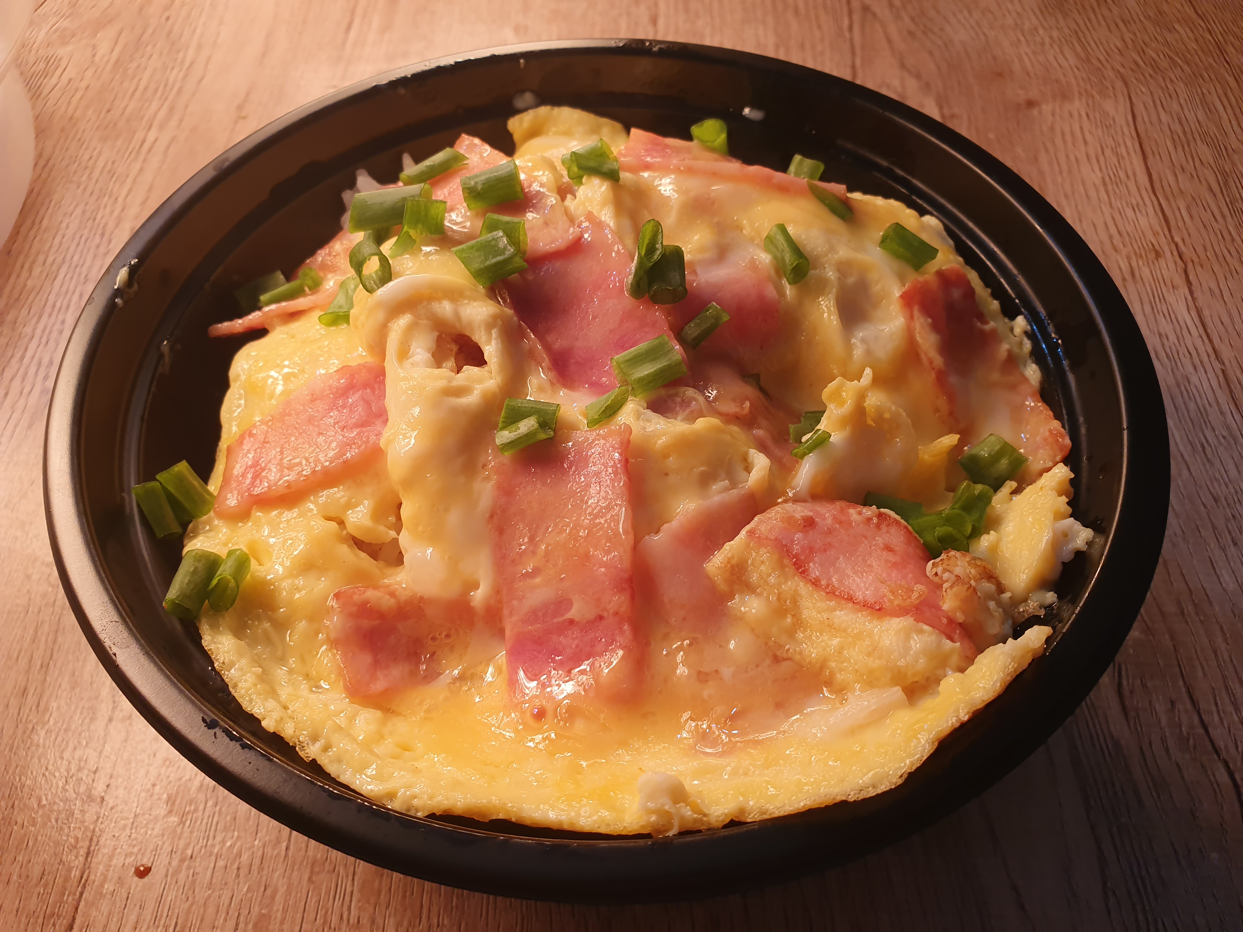 ข้าวสวยร้อน ราดด้วย แฮมและไข่ข้น โรยหน้าด้วยหอมซอย